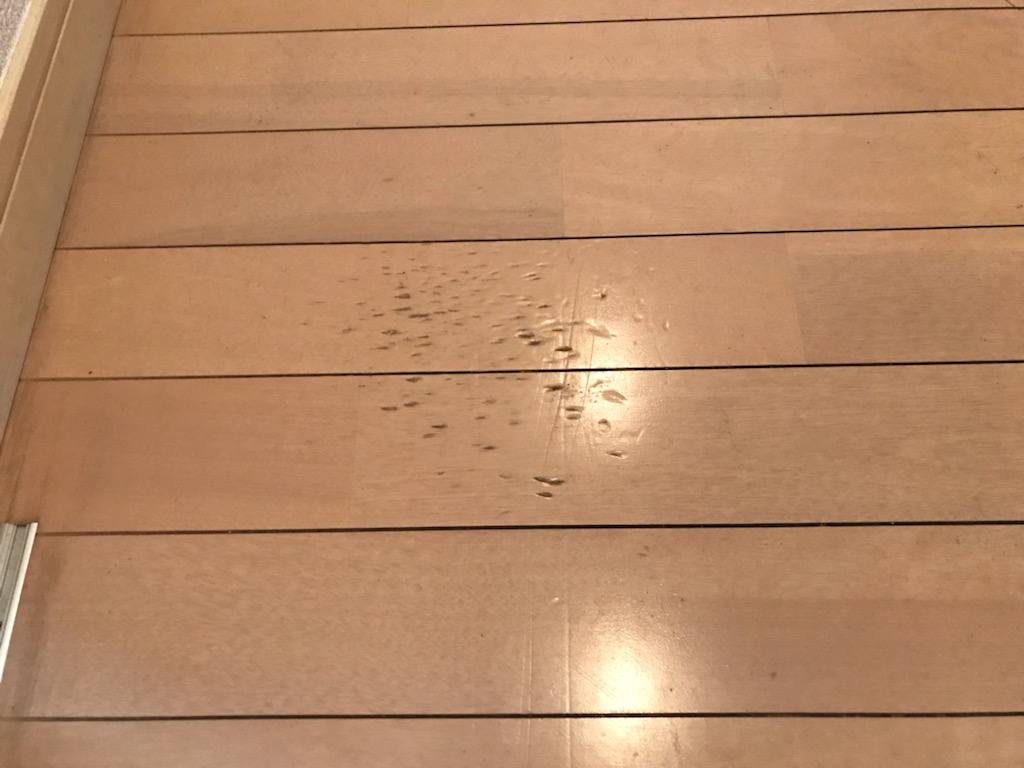 洋室のフローリング床に、直径20cm範囲で小さなヘコミキズが多数あります。