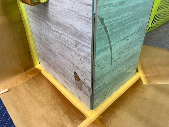 運送業者の事故でマンションエントランスの壁が破損してしまったようです。