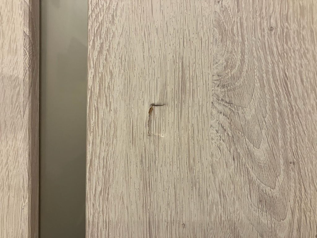 センタードアの表面に5cm四方ほどの陥没があります。