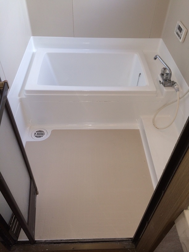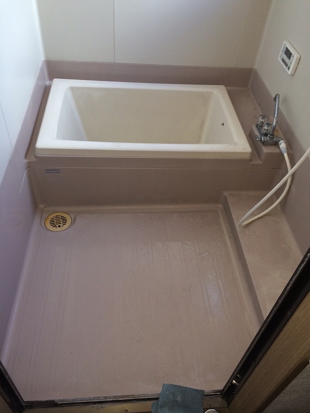 色あせて古く見える浴室を再生塗装コート・床パネル施工にて。