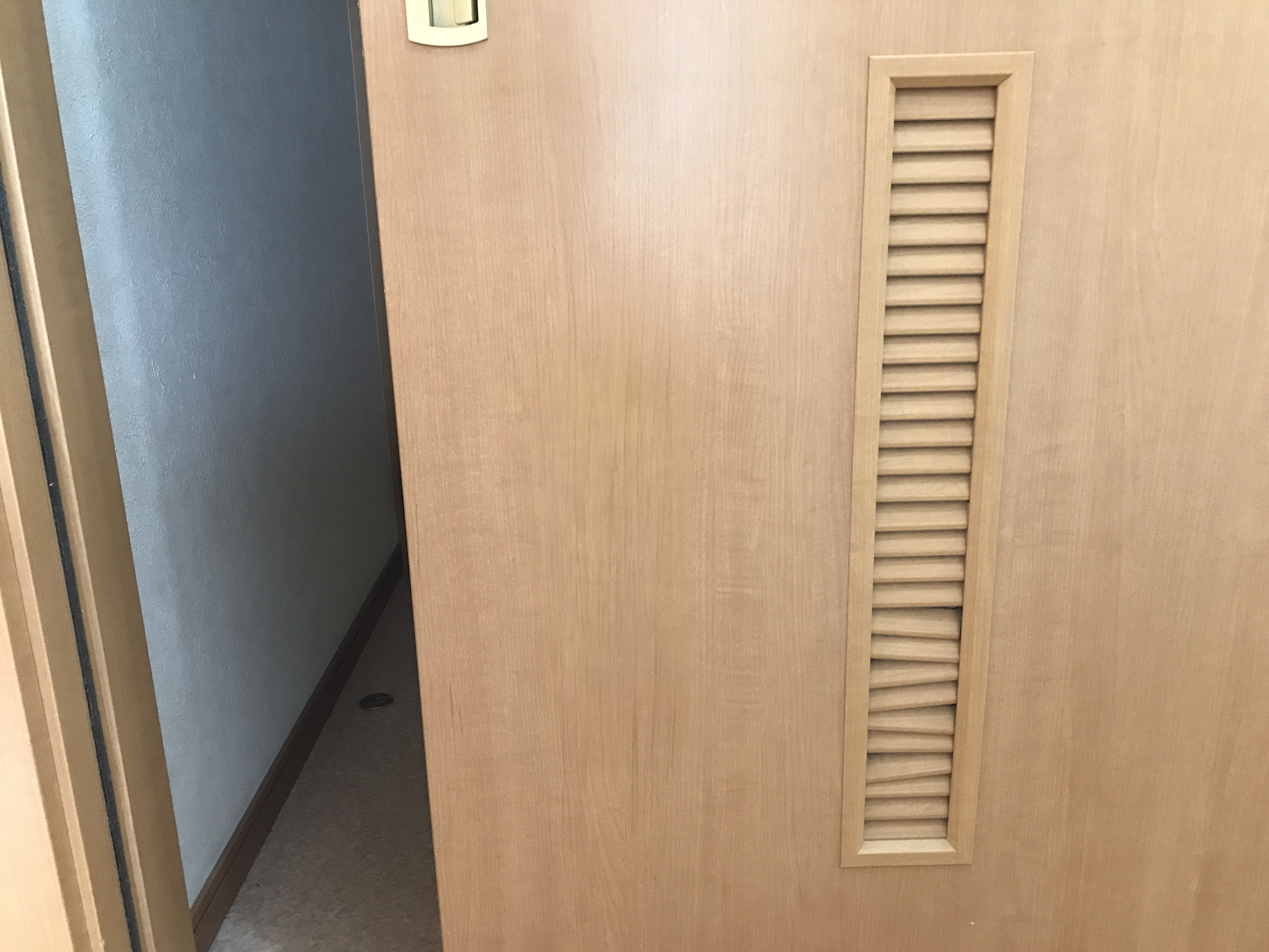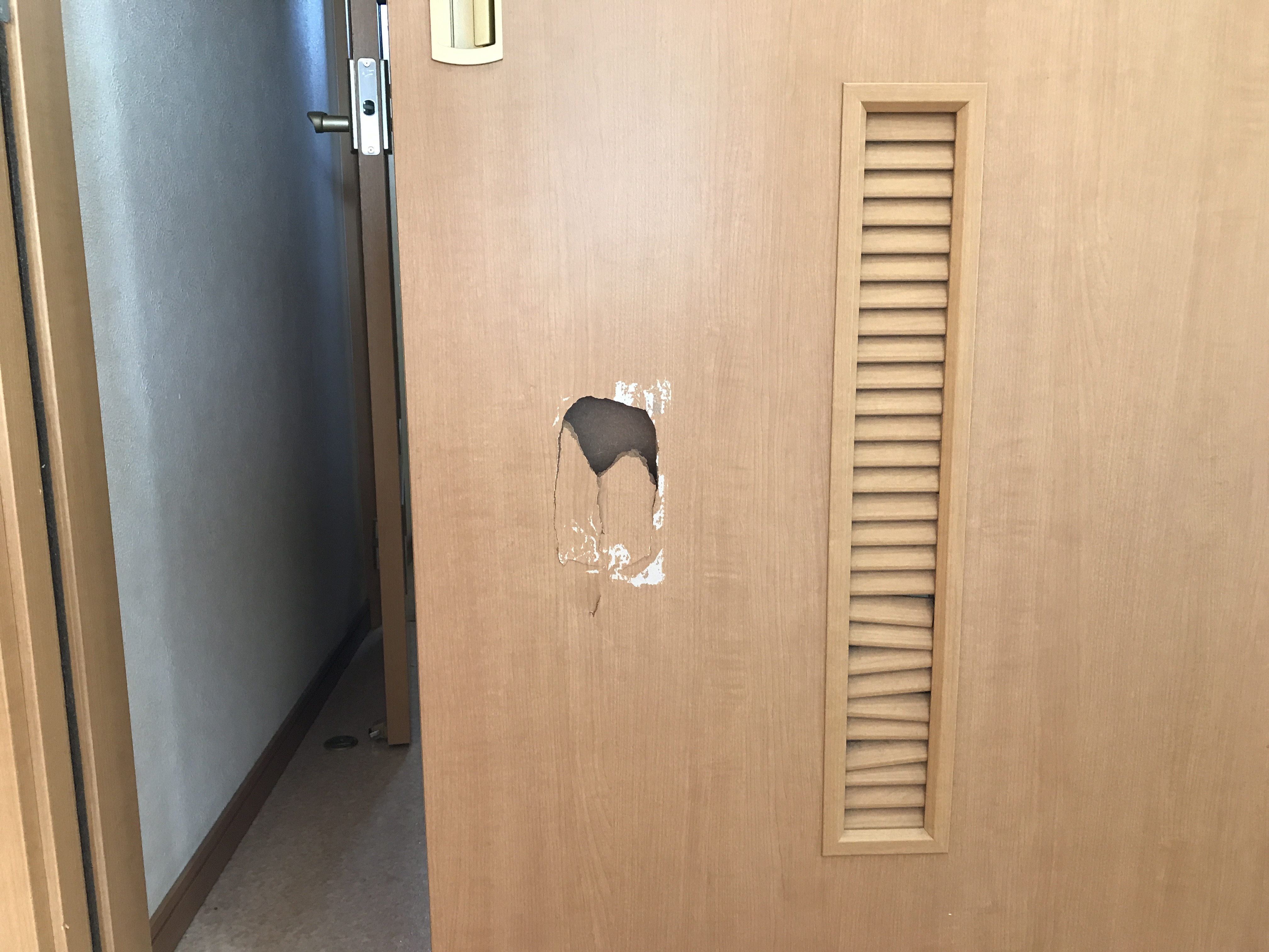 荷物をぶつけてドア表面に穴が開いてしまったようです。