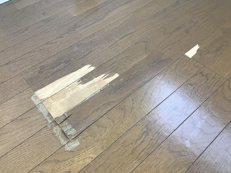 洋室のフローリング表面単板が剥がれてしまっています。
