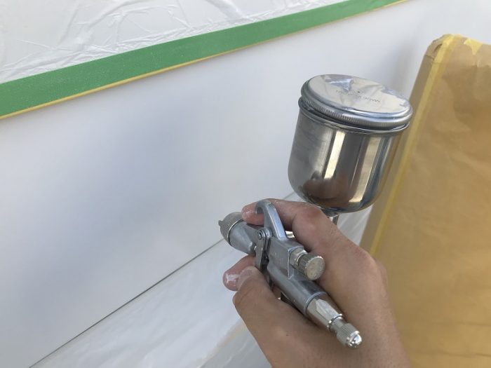 大野城市の新築戸建物件にて、外壁のへこみキズ補修。